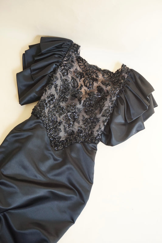 Vintage Black Beaded Lace Dramatic Sleeve Open Back Cocktail Statement Gown