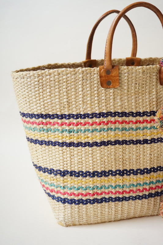 MAR Y SOL Caracas Striped Sisal/ Seagrass Pom Pom Market Tote