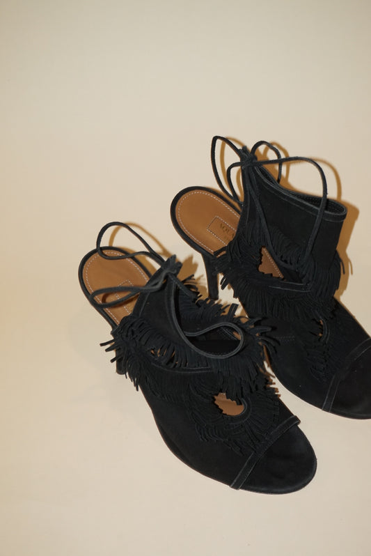 Aquazzura Fringe Gladiator Black Suede Sandal Heel - Size 37.5