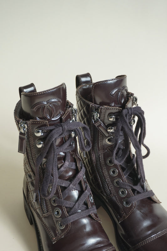 • “Chanel” Dark Burgundy Shiny Calfskin Quilted CC Lace Up Combat Boots - Size 36.5