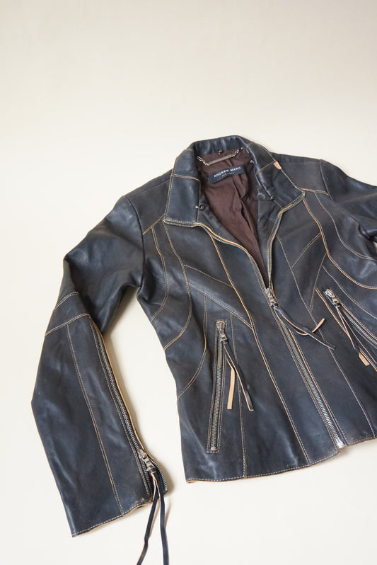 Andrew Marc NY Charcoal Brown Raw Edge Leather Top Stitch Moto Jacket - Size XS