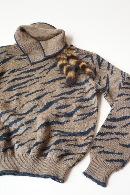 Vintage Sunbow 2 80s Brown Black Tiger Striped Pullover Sweater With Real Fox Tails - Size Medium