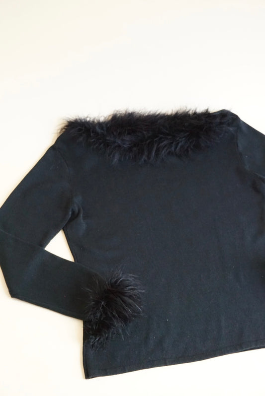 Joesph A. Silk Blend Black Knit Feather Trim Y2K Blouse - Size Large