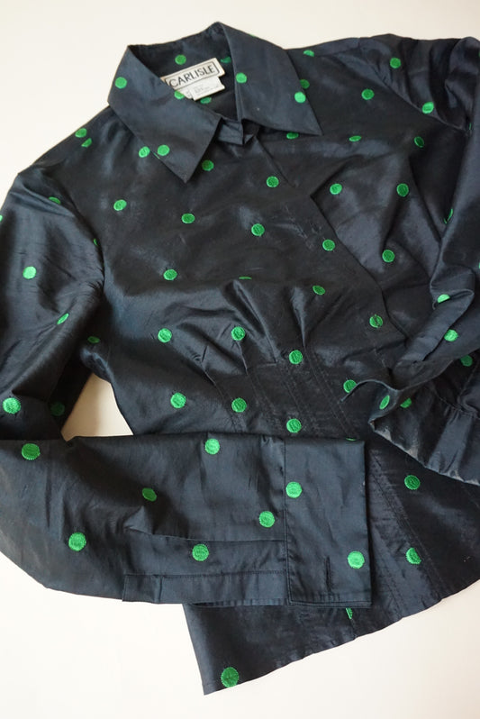 Carlisle Vintage Black Raw Silk Embroidered Green Polka Dot Blouse - Size 12
