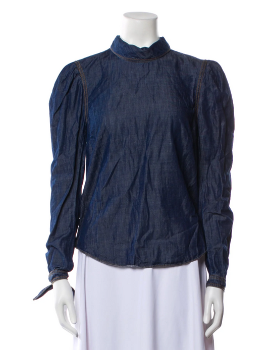 "Veronica Beard" "Isabel" Chambray Puff Sleeve Denim Mock Neck Top