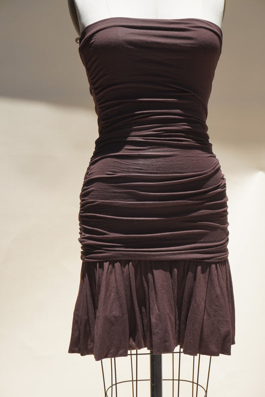 “BCBGMAXAZRIA” Vintage Brown Mini Strapless Ruffle Hem Knit Dress - Size
