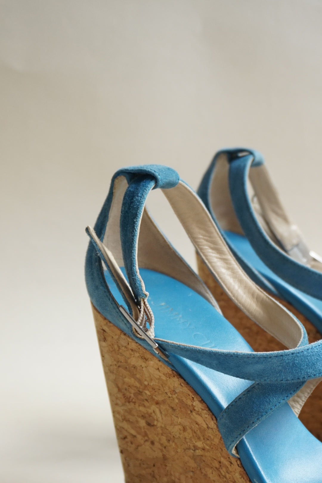 “Jimmy Choo” Blue Suede Cross Strap Cork Wedges - Size 38.5